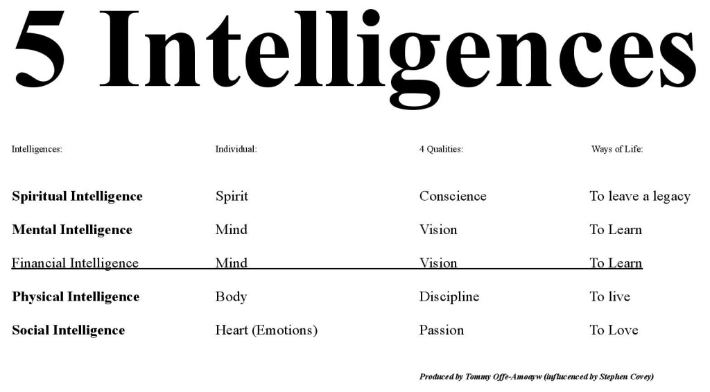 After years of reading and applying the knowledge, my conclusion was that mastering ourselves in relation to the proceeding five areas (5 Intelligences) would be crucial for many: